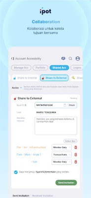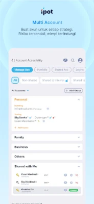 Fleksibilitas menjadi inti dari pengalaman investasi di IPOT. Baik Anda seorang investor mandiri yang mencari otonomi penuh, individu yang membutuhkan bimbingan dari mentor berpengalaman, atau bahkan keluarga yang ingin menanamkan literasi finansial sejak dini kepada anak, IPOT menyediakan peran yang tepat. Fitur Shared Access memungkinkan kolaborasi investasi yang transparan dan aman, mulai dari berbagi portofolio dengan teman atau keluarga hingga mengelola tujuan keuangan kolektif dalam komunitas. Para profesional pun dapat memantau portofolio klien mereka secara mulus dan real-time. Untuk setiap sasaran investasi Anda, fitur Multi Account hadir untuk memisahkan dan mengelola berbagai tujuan finansial dalam satu aplikasi yang terorganisir, memastikan fokus dan manajemen risiko yang optimal.