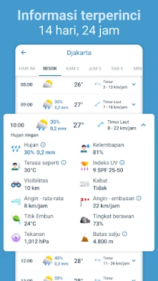Telusuri lapisan cuaca dengan visualisasi canggih: mulai dari radar hujan beresolusi tinggi yang melacak presipitasi, hingga peta interaktif dengan overlay suhu, hujan, salju, dan tekanan, lengkap dengan animasi partikel yang menunjukkan arah angin dan gelombang. Jangan lewatkan pula citra satelit historis hingga 12 jam ke belakang. Keamanan Anda adalah prioritas; Meteored menyampaikan peringatan bahaya resmi secara real-time dari BMKG untuk wilayah Indonesia dan penyedia terkemuka lainnya secara global, memastikan Anda selalu selangkah di depan menghadapi kondisi ekstrem. Selain itu, dapatkan detail kualitas udara, kelembapan, dan data alergi untuk menjaga kesehatan dan merencanakan kegiatan luar ruangan Anda dengan bijak, serta nikmati informasi astronomi seperti matahari terbit, terbenam, dan fase bulan.